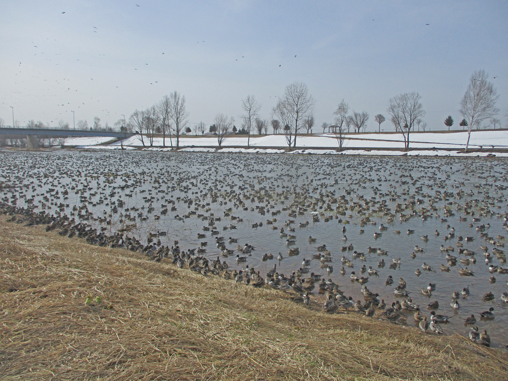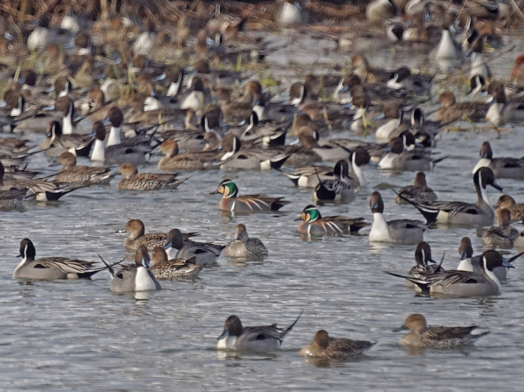 数万羽のオナガガモの中に、何とかトモエガモを見つけました。
