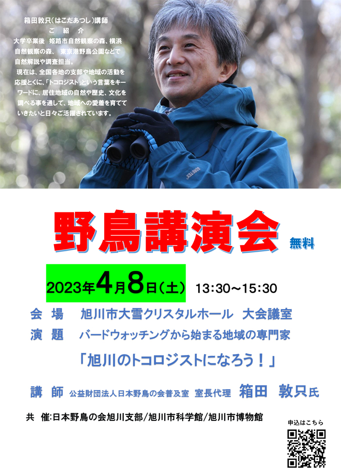 日本野鳥会旭川支部、旭川市科学館、旭川市博物館共催の「野鳥講演会」(無料)が