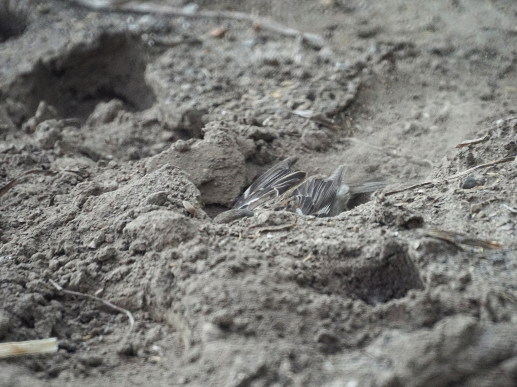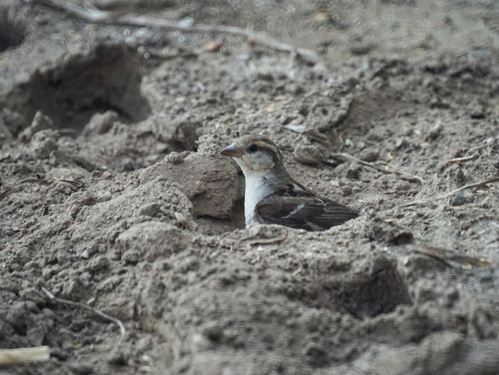 タマネギを収穫した穴で、珍しくニュウナイスズメが砂浴び。