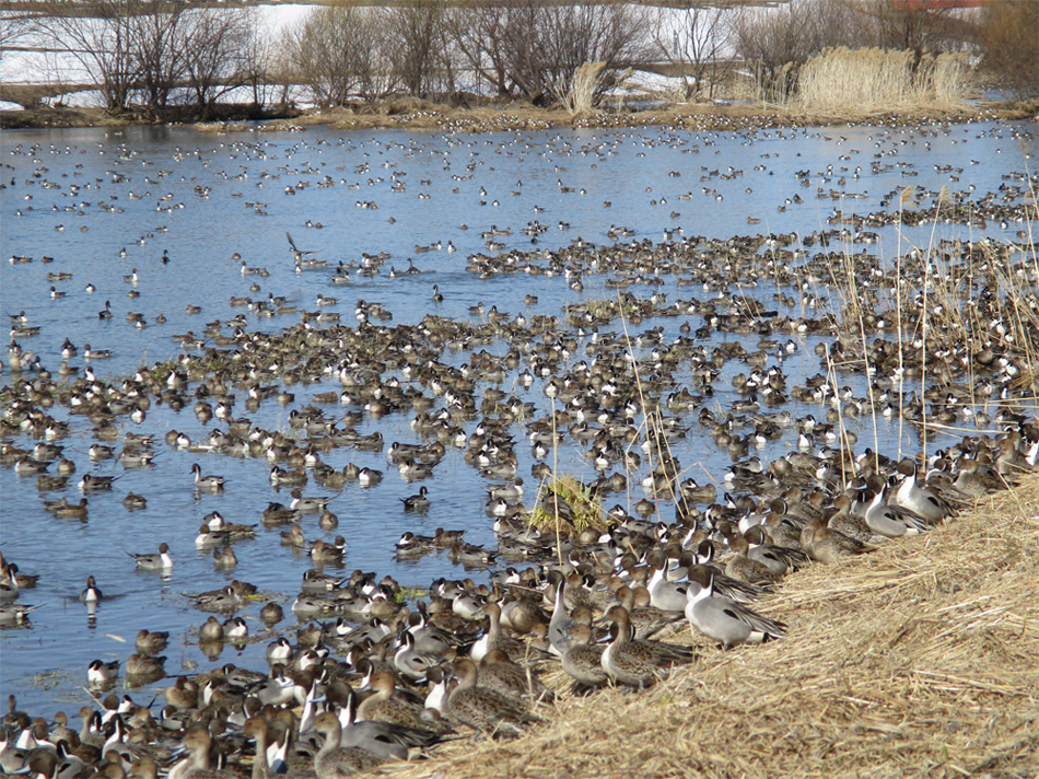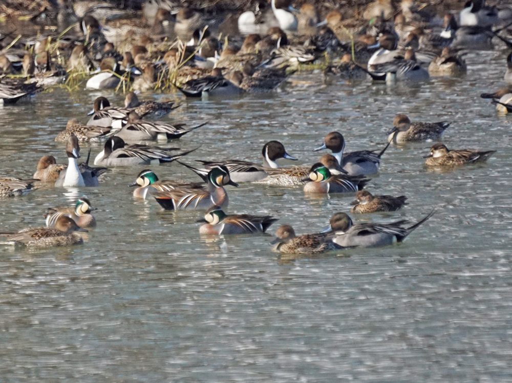 オナガガモがやや少なくなり(まだ、万単位)、トモエガモが